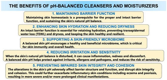 The importance of maintaining the SC acid mantle is well recognized. The focus is predominantly on preserving or restoring the skin’s acidic milieu by selecting topical formulations that are compatible with the skin’s acid mantle. Skincare formulations, including pH-balanced, non-soap-based, and low-irritating cleansers and pH-balanced moisturizers formulated at an acidic pH that matches that of the skin to keep the skin at optimum health, represent a foundation principle in skincare [,,]. By virtue of their pH being the same as the skin pH and containing a blend of ingredients that are beneficial to the skin (e.g., ceramides, cholesterol, free fatty acids) [,], these pH-balanced cleansers and moisturizers are gentler and milder to the skin than those formulated under any other pH conditions []. The consensus opinion [,,,,,,,,,,] is that healthy, young, mature, aged, eczematous, or psoriatic skin should be cleansed on a daily basis with a pH-balanced cleanser, and subsequently moisturized with a pH-balanced moisturizer. Such a skincare routine helps maintain the barrier function, enhance skin hydration, support the skin microbiome, reduce skin dryness, sensitivity, and irritation, and prevent impaired skin integrity [,,,,,,,,,,,] (Figure 3).