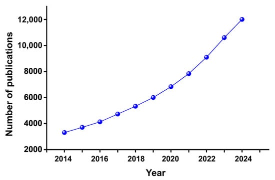 Increase in publications based on searches using pertinent keywords (rice, skincare, and cosmetics) of the Google Scholar database from 2014 to 2024.