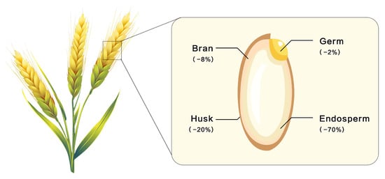 Rice generally consists of four main parts: the husk (~20%), the germ (~2%), the endosperm (~70%), and the bran (~8%) (Figure 2). The husk, primarily composed of cellulose, serves as the outer protective layer and is removed during processing. For fermentation purposes, the germ and bran of rice are commonly utilized due to their higher nutrient contents (e.g., proteins, vitamins, amino acids, and polyphenols) and their capacity to support microbial growth. The endosperm, primarily composed of starch, is less frequently utilized in fermentation; however, it can function as a secondary carbon source, as microorganisms are capable of hydrolyzing the starch into fermentable sugars.