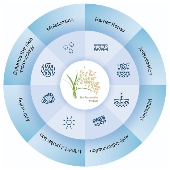 The skin microbiome, composed of a diverse array of microorganisms, plays a crucial role in maintaining skin health and homeostasis []. Disruptions to this delicate balance can lead to various skin conditions, including acne, eczema, and atopic dermatitis. During rice fermentation, beneficial microorganisms such as Lactobacillus and Saccharomyces are often introduced. These probiotics, along with their metabolites, can positively influence the skin microbiome. An increasing number of studies have demonstrated that RFPs can help balance the skin microbiome by increasing the abundance of beneficial microorganisms while reducing harmful pathogens [,,,]. For instance, Iemsam-arng et al. investigated the prebiotic potential of fermented glutinous rice filtrate and found that it enhanced the growth of beneficial bacteria (Staphylococcus epidermidis) while inhibiting pathogenic bacteria (Staphylococcus aureus) []. In another study, Sutthanut et al. reported that fermented rice bran extracts from black rice and germinated brown rice exhibited antipathogenic activity against Escherichia coli and Staphylococcus aureus [].