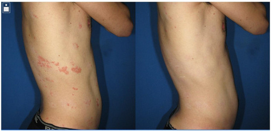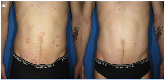 On the left, a patient with plaque psoriasis; on the right, the same patient 1 month after starting blue light therapy.