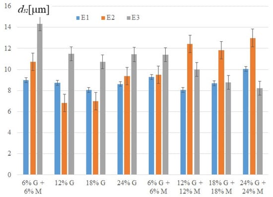 Sauter diameters for emulsions with glycerine (G) and addition of macadamia oil (M) prepared with emulsifiers: E1—self-emulsifying apricot kernel oil base; E2—soya lecithin; E3—natural emulsifier from olive oil—O/W type.