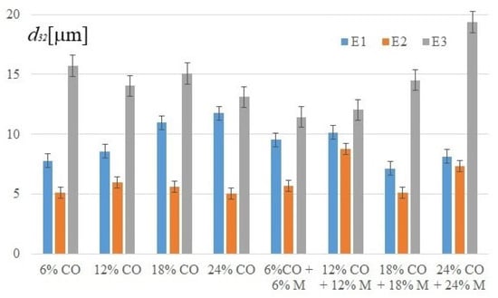When comparing the equivalent droplet diameters for the emulsifiers E1 and E2, similar results were obtained. These values remained at a similar level regardless of the component concentrations used. In most cases, emulsions with soya lecithin showed the smallest droplet diameters, but it should be taken into account that these were differences of less than 3 μm. Despite the smallest droplet sizes, emulsions with soy lecithin did not remain stable, even in the short term, due to unfavorable interactions between the components.