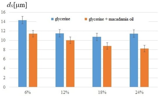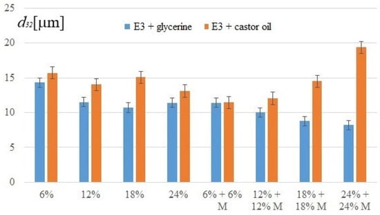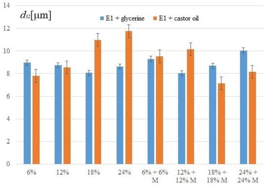 Based on visual observation, it has been found that the emulsifier from apricot kernel oil allowed emulsions to be produced that were stable throughout the study period. Neither the change of glycerine to castor oil nor the addition of macadamia oil adversely affected the properties of these mixtures. Therefore, the focus was on analyzing the samples with emulsifier E1. First, the Sauter diameters of the emulsions with glycerine and castor oil were compared. The results are shown in Figure 4.