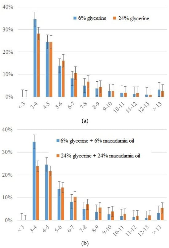The percentage of droplets in the different samples with emulsifier E1 was further analyzed. Figure 5a shows graphs comparing the percentage of droplets for the emulsions with the smallest (sample 1) and largest (sample 4) proportion of glycerine. Figure 5b, on the other hand, illustrates the same comparison, but for the samples with the smallest (sample 5) and largest (sample 8) proportions of glycerine and macadamia oil.