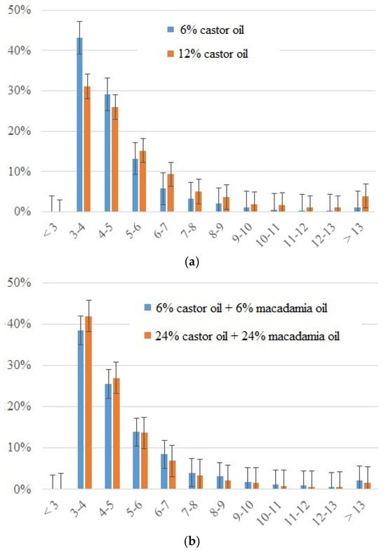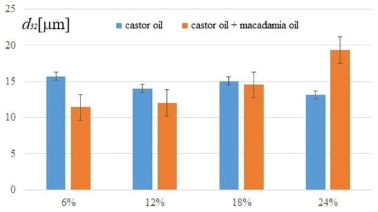 An emulsion with 6% macadamia oil yielded a mixture with almost 40% of 3–4 μm droplets. When the concentration was increased to 24%, the percentage of this droplet size increased to more than 40%. This means that the addition of macadamia oil has a positive effect on the formation of small-droplet-size emulsions, even with 24% content of castor oil, which when used alone has the opposite effect.