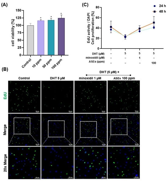Cell viability and cell proliferation of ASEs in HFDPCs. (A) Cell viability of ASEs at different concentrations, was assessed by EZ-cytox assay. (B) Cells were treated with 5 μM DHT, 1 μM minoxidil, or 100 ppm ASEs for 48 h. Cell proliferation was determined by EdU staining assay (scale bars, 100 µm). (C) Cell proliferation was measured by EdU staining assay after 24 and 48 h. Cell viability and proliferation were determined as the percentage (%) of viable cells compared to the untreated cells. All data are presented as mean ± SD (n = 3). These images were acquired from three independent experiments. * p < 0.05 compared to the control group.