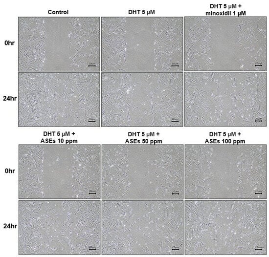 HFDPCs were seeded in a 6-well plate. The cells were incubated at 37 °C until they reached approximately 80% confluence after 24 h. A 200 µL pipette tip was then used to create a horizontal scratch through the center of the confluent cell layer. The cells were washed once with DPBS, and a fresh medium was added. HFDPCs were subsequently treated with 5 µM DHT, 1 µM minoxidil, and ASEs at concentrations of 10 ppm, 50 ppm, and 100 ppm, respectively. Wound healing was monitored at 0 and 24 h marks post-wound creation. Images of both treated and untreated control cells were captured using phase-contrast microscopy (Microscope ECLIPSE Ts2, Nikon, Tokyo, Japan).