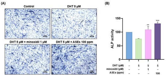 Effects of ASEs on the expression levels of ALP in DHT-damaged HFDPCs. (A) The ALP assay was performed on HFDPCs damaged by 5 μM DHT. HFDPCs were pre-treated with 100 ppm ASEs and 1 μM minoxidil for 24 h, followed by exposure to 5 μM DHT to induce damage (scale bars, 20 µm). (B) ALP activity was increased in HFDPCs treated with ASEs. These images were acquired from three independent experiments (n = 3). ** p < 0.01, *** p < 0.001 compared to the only DHT-treated group.