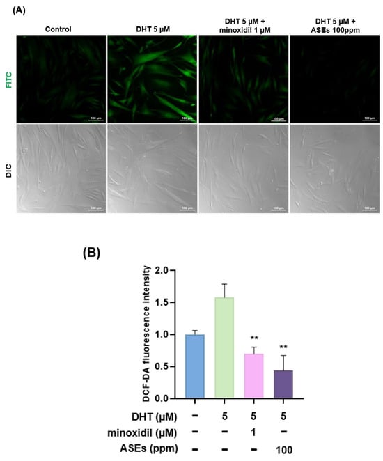 Effects of ASEs on ROS levels in HFDPCs damaged by DHT. The measurement of ROS levels was performed for HFDPCs damaged by 5 μM DHT. (A) One hundred ppm ASEs and 1 μM minoxidil were pre-treated for 24 h followed by 5 μM DHT damage. (B) Reduced ROS levels in damaged HFDPCs treated with DHT from ASEs. DCF-DA images were captured using an Eclipse Ti2 fluorescence live-cell imaging microscope (scale bars, 100 µm), and the intensity of the green fluorescence (FITC) correlates with the concentration of ROS. These images were acquired from three independent experiments (n = 3). ** p < 0.01 compared to the only DHT-treated group.