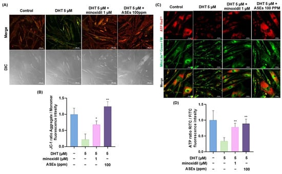 The anagen phase of hair growth involves cell division in the dermal papilla, which increases energy demands and reliance on mitochondrial respiration [,]. Consequently, mitochondrial function plays a critical role in hair growth regulation [,]. We assessed changes in mitochondrial membrane potential in DHT-damaged HDFPCs treated with ASEs using the JC-1 assay.