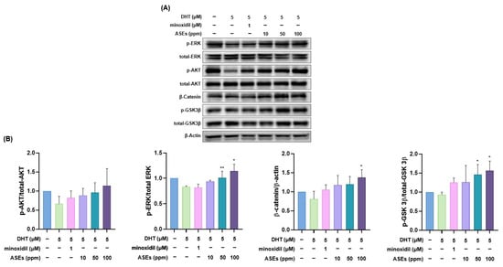 HFDPCs were plated in dishes and incubated for 24 h. Cells were treated with DHT 5 µM, 1 µM minoxidil, and ASEs (10, 50, and 100 ppm) for 24 h. Cells were washed with DPBS, and protein extraction was performed using RIPA buffer. The proteins were sonicated for 5 min and centrifuged at 12,000 rpm, 10 min, and 4 °C. The supernatants were harvested, and the total protein concentration was assessed by the Pierce™ BCA Protein Assay Kit (Thermo Fisher Scientific, Waltham, MA, USA). The proteins were equalized with 4× LDS sample buffer diluted in RIPA buffer and heated on a heat block at 70 °C for 10 min. The membranes were incubated by 5% non-fat dry milk in TBS-T with 0.1% Tween 20. After blocking, primary antibodies including phospho-ERK/ERK, phospho-AKT/AKT, phospho-GSK-3β/GSK-3β, and β-catenin (Cell Signaling Technology, Danvers, MA, USA) were incubated overnight on the shaker. After that, the secondary antibody was incubated for 2 h and washed with TBS-T for 10 min. The immunoreactive bands were finally detected using the ECL reagent (1:1), the images were captured using the Invitrogen iBright 1500 (Waltham, MA, USA), and the data were analyzed with Fiji ImageJ software (Windows 64-bit).