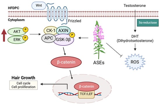 In our study, we investigated whether ASEs could increase hair growth in DHT-damaged HFDPCs. Treatment with ASEs increased the proliferation rate (Figure 1C) and activated the migration of cells in HFDPCs damaged by DHT (Figure 2). In addition, alkaline phosphatase activity, a marker of the hair follicle cell growth cycle, was enhanced (Figure 3). ROS is a key factor in hair loss, and ASEs were shown to effectively suppress ROS levels compared to the DHT-damaged group (Figure 4). Mitochondria are membrane-bound organelles that play crucial roles in various cellular processes, including ATP production, metabolism, calcium signaling, redox signaling, and apoptosis [,]. Interestingly, ASEs restored mitochondrial function in DHT-damaged HFDPCs (Figure 5A). In addition, ASEs increased ATP activity by utilizing the membrane potential recovery capacity of mitochondria (Figure 5C). Activation of the Wnt/β-catenin pathway promotes hair cycle and regeneration [,]. In the absence of the Wnt pathway activation, β-catenin accumulates in the cytoplasm, where it is ubiquitinated and degraded by GSK-3β, which forms a complex with APC/Axin/GSK-3β [,]. The elevated levels of β-catenin in the nucleus activate target genes, including cyclin D1, which facilitates cell proliferation [,]. Based on this, we confirmed that treatment with ASEs enhanced the expression level of β-catenin and increased the phosphorylation level of GSK-3β (Figure 6). AKT is a critical protein that functions downstream of the P13K pathway to regulate the cellular response to external stimuli [,]. Phosphorylated AKT is found in mitochondria and nuclei, where it interacts with different molecules [,]. We demonstrated that ASEs inhibit β-catenin degradation, activate its nuclear migration, and induce cell growth through the ERK/AKT pathway, suggesting that ASEs may effectively prevent hair loss (Figure 7).