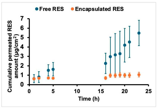 Permeation studies have highlighted significant differences between free RES in Tween 80 solution and encapsulated RES (F2). Free RES skin permeation was significantly higher than encapsulated RES, thus confirming the ability of the particles to retain the encapsulated RES (Figure 1). The high standard deviation observed in both profiles is due to the non-uniformity of the skin tissue and the low permeated amounts, which were close to the quantification limit. In addition, free RES presents low solubility and high instability, affecting reproducibility. As the concentration in both formulations is the same, the permeability coefficient calculated by dividing the flow by the dose is also higher for the RES solution. However, the solution is close to saturation, which indicates a high thermodynamic activity, promoting its potential for enhanced skin permeation. This is not the case in the encapsulated form, where two fractions can be observed, namely the encapsulated remaining RES and the released RES. In this case, the main objective was to achieve a controlled release and prolonged permeability of RES over time. These findings align with the literature, where nanoparticle encapsulation significantly reduced skin permeation by a controlled release [24,25].