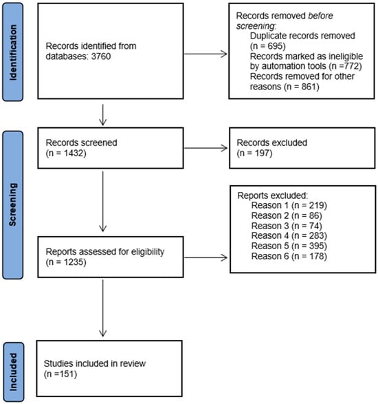 The initial database search across PubMed, Scopus, Google Scholar, and ScienceDirect identified a total of 3760 potentially relevant scientific works, selected based on their titles. Following the removal of duplicate entries, 1432 unique studies remained for initial screening. To refine the selection, an evaluation of abstracts was conducted, which led to the exclusion of 197 articles due to insufficient data, irrelevance to the research question, or use of study strategies that did not align with the scope of this systematic review. This process resulted in 1235 full-text articles being considered for detailed analysis.