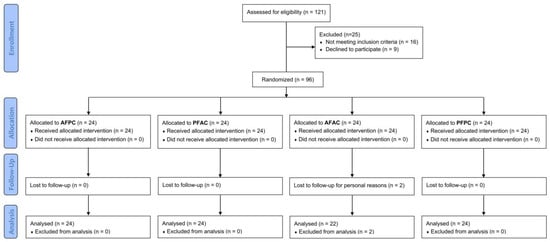 A total of 121 (n = 121) subjects were screened; 25 were excluded, with 16 not meeting the inclusion criteria and 9 declining to participate. The trial successfully randomized 96 subjects with 24 subjects per group. Ninety-four subjects completed the study, while two subjects in the AFAC group dropped out for personal reasons not related to products use. The participant flow chart is reported in Figure 1.