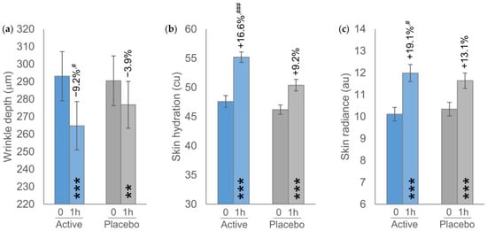 A statistically significant increase in skin radiance (Figure 2c) was recorded with both the active (+19.1%, p < 0.001) and the placebo cream (+13.1%, p < 0.001) after 1 h, with a 1.5 times greater effect for the active cream (p < 0.05).