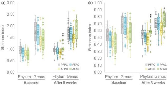 Both the alpha (Shannon and Simpson index) and beta diversity indexes remained unchanged (p > 0.05) in the AFPC, PFAC, and PFPC groups (Figure 3). In contrast, a statistically significant difference between week 4 and 8 was observed in the AFAC group for both the Shannon (p < 0.01 at phylum level) and the Simpson index (p < 0.01 at phylum and p < 0.05 at genus level) but not for the beta diversity index (p > 0.05).