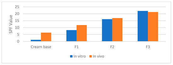 The SPF values obtained through in vitro and in vivo methods are presented in Table 6 and Figure 3. The Sun Protection Factor (SPF) of each formulation was evaluated using both methodologies, as summarized in Table 6. The findings revealed that the cream base exhibited a relatively low SPF value, with an in vitro SPF of 1.125 ± 0.109 and an in vivo SPF of 6.34 ± 1.068. In contrast, formulations containing bromelain (F1, F2, and F3) demonstrated significantly higher SPF values, indicating enhanced photoprotective potential.