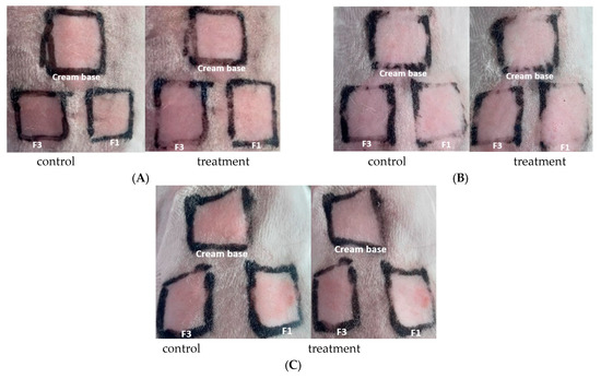 The irritation test was conducted using female albino rabbits (Oryctolagus cuniculus). Three healthy and active rabbits were selected. In the skin irritation test, an area of 2 × 2 cm was shaved before the test began. A dose of 2 mg/cm2 cream was applied. The first area received cream as a control, the second area received cream F1, and the third area received cream F3. The treated areas on the animal’s back were covered with sterile gauze, plastic, and bandages to prevent evaporation. The coverings were sequentially removed after 3 min, 1 h, and 4 h. The responses were assessed every hour after treatment. Observations were made based on signs of erythema and edema at 1, 24, 48, 72 h, as well as on days 7 and 14 after treatment. The observation results were scored based on the severity of the skin irritation [25].