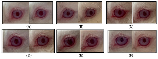 Observation of the ocular irritation test (A) test animal 1 was administered F1; (B) test animal 2 was administered F1; (C) test animal 3 was administered F1; (D) test animal 1 was administered F3; (E) test animal 2 was administered F3; (F) test animal 3 was administered F3.