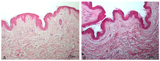 The treated sample’s epidermis (B) does not differ from the control sample (A) in any way; no changes can be noticed in epidermis immediately after treatment (B) because of skin cooling performed by the device handpiece. Additionally, the dermis’s collagen seems to be strongly colored as a result of the heat-induced shrinkage or tightening of the collagen, which increases eosinophilia. ((A,B) 10× Magnifications).