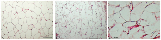 In the adipose tissue immediately after treatment (B,C), the following are observed: wavy adipocitary membranes (weakening of membranes), some rupture of the plasma membrane, and initial hyperemia with dilation of blood vessels (C). In the control sample (A), packed adipocytes. ((A,B) 10× Magnification; (C), 40× Magnification).
