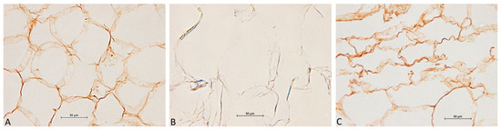 Adipocytes positive to Perilipin-1 in the control sample (A). After treatment with ONDA (B,C), adipocyte membranes are interrupted with negative Perilipin-1 results (non-viable adipocytes) (1.5–1.8 cm from the epidermis) (B); Perilipin-1 is still present in the wavy adipocitary membranes (more than 2 cm from the epidermis) (C). ((A–C), 40× Magnification).