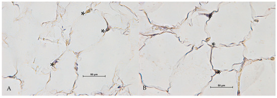 CD68 positive cells (*) between adipocytes, with broken or wavy membranes after treatment with ONDA (A,B) ((A,B), 40× Magnification).