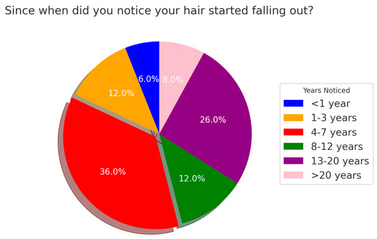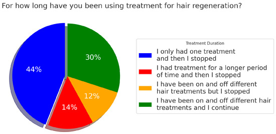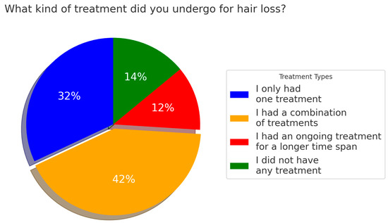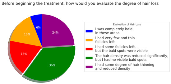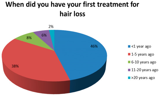In terms of the debut of the treatment for hair loss, a very high percentage had started therapy quite recently (<1 year), and more than 80% of the responders had initiated treatment in the past 5 years. This might be an indicator that hair therapies have grown more popular recently and that their efficiency might have spread their popularity among the general population.