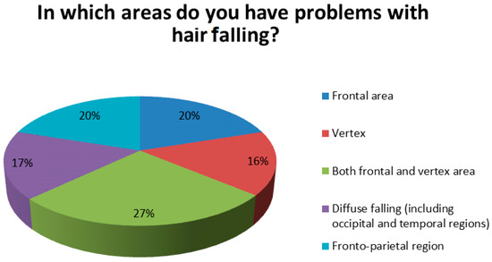 When asked about the regions in which the patients had problems with hair falling out, both the frontal and vertex areas was the most frequent answer, followed by a diffuse pattern of hair falling (including the occipital and temporal regions). What was extremely important, however, in the correlation of the pattern of baldness with sex was the fact that almost all of the responders (11/12 patients) who claimed to have a diffuse hair falling pattern (including the occipital and temporal regions) were women.