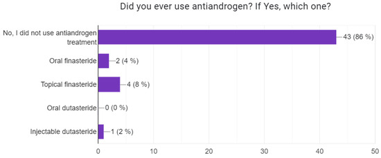 Concerning hormonal treatment (spironolactone, flutamide, bicalutamide, cyproterone acetate, and clascoterone), the majority of patients (96%) reported not using it. The use of antiandrogen treatment is presented in Figure 6.