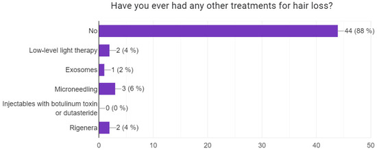 Hormonal treatment and antiandrogen therapies were not among the most used due to their possible side effects—erectile dysfunction, decreased libido, and ejaculation problems [2,50]. The other treatments included oral vitamins and minerals (31/50 patients), showing that most patients are more likely to try non-invasive procedures before going for more invasive and expensive treatments. However, only 11 patients had a blood analysis conducted to see whether they were lacking vitamins/minerals—the other 20 patients tried these supplements without knowing whether they had a deficit or not.