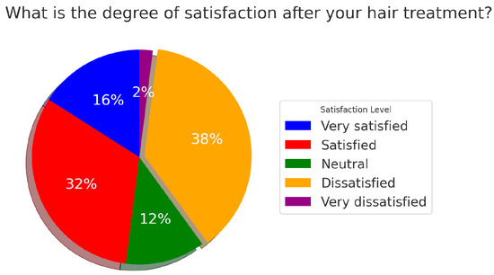In our study, most of the patients underwent only one session/treatment and then stopped. This might explain the discrete results in some who said that they did not notice any change or only noticed a moderate improvement in density and thickness. In terms of satisfaction, most of the patients (38%) were neutral about the treatment, with answers of satisfied and highly satisfied accounting for 48% of the patients. Satisfaction based on the results might also have had a direct relationship with the treatment used (with the most highly satisfied patients being those who underwent a hair transplant).