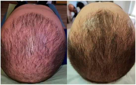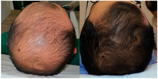 The clinical results are based on a series of pre- and post-treatment images, which highlight visible improvements in hair density and thickness in patients treated with a combination of a topical mixture of finasteride and minoxidil with/without PRP infiltration (Figure 10, Figure 11 and Figure 12). These images (Figure 10, Figure 11 and Figure 12) depict enhanced scalp coverage, particularly in the frontal and vertex regions, where hair loss was initially prominent.
