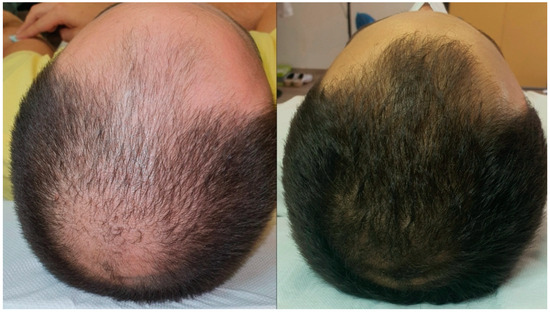 Before-and-after photos of the patients who underwent treatment with PRP infiltration and topical foam with 0.5% finasteride and 5% minoxidil were taken in order to observe the clinical results of this treatment.