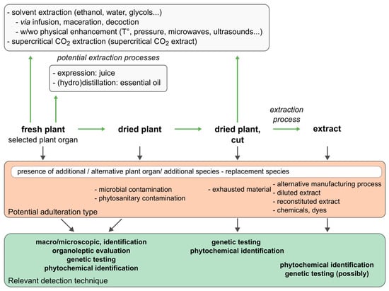 Two generic types of adulteration are possible: the first involves the initial raw material, and the second concerns the resulting extract or powder obtained through processing the BRM: