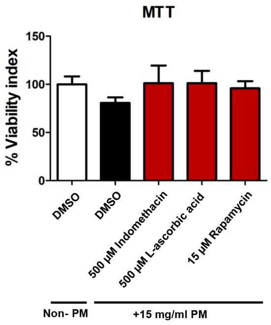 To evaluate whether co-treatment with topical application of 15 mg/mL PM and culture medium-based exposure to 500 µM indomethacin, 500 µM L-ascorbic acid, or 15 µM rapamycin resulted in significant toxicity, which could compromise the integrity of the data, tissue viability was assessed using the MTT assay following 48 h of treatment. As illustrated in Figure 1, the viability index, normalized to tissue weight, did not show a statistically significant decrease compared to control tissues not exposed to PM. These findings suggest that the tested compounds, at the specified concentrations, did not induce toxicity under the conditions of PM-induced skin damage.