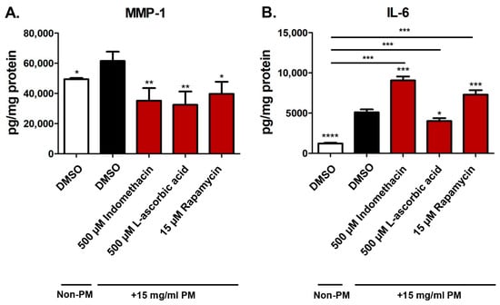 MMP-1 secretion was evaluated to determine the effects of PM exposure and treatment with test compounds on extracellular matrix degradation. Our study observed a 1.3-fold increase in MMP-1 secretion following treatment with 15 mg/mL PM (Figure 2A). Notably, culture medium-based treatment with indomethacin, L-ascorbic acid, and rapamycin significantly reduced MMP-1 levels by 43%, 47%, and 35%, respectively, compared to the PM-exposed DMSO group, and brought levels close to baseline relative to DMSO without PM (Figure 2A). These suggests their potential to mitigate PM-induced collagen degradation.