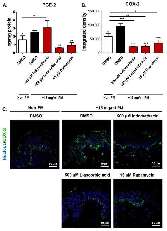 To evaluate the inflammatory response, COX-2 and PGE-2 expression levels were measured following PM exposure. Our results demonstrated that PM exposure increased the expression of COX-2 and PGE-2 by 1.6-fold compared to unexposed PM tissues (Figure 3). Culture medium-based treatment with 500 µM indomethacin, 500 µM L-ascorbic acid, and 15 µM rapamycin reduced COX-2 protein expression in skin tissues by 76%, 75%, and 62%, respectively, compared to PM-exposed DMSO tissues, and all reduced COX-2 below baseline levels (Figure 3B). These results suggest potent anti-inflammatory effects through COX-2 suppression, potentially beyond normal physiological levels. Representative images of COX-2 immunofluorescence staining are shown in Figure 3C. However, only 500 µM L-ascorbic acid and 15 µM rapamycin effectively reduced PGE-2 secretion by 77% and 64%, respectively, compared to PM-exposed tissues. In contrast, 500 µM indomethacin had no significant effect compared to PM-exposed tissues (Figure 3A). These findings suggest that while indomethacin can suppress COX-2 expression, it does not impact PGE-2 secretion. In contrast, L-ascorbic acid and rapamycin demonstrate efficacy in reducing both COX-2 and PGE-2, indicating their potential to mitigate PM-induced inflammation.