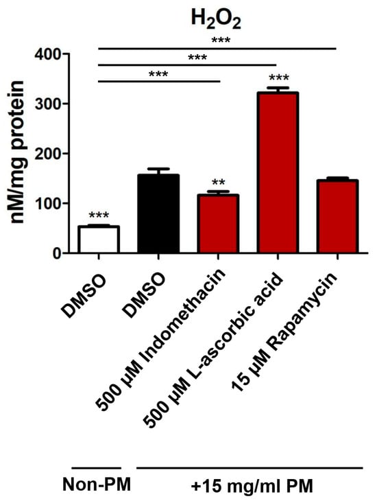 To assess oxidative stress, H2O2 levels were measured, as H2O2 is relatively stable compared to other reactive oxygen species and is easier to detect and quantify [28,29]. Our results showed that exposure to 15 mg/mL PM increased H2O2 levels by 2.9-fold compared to untreated PM tissues. Notably, only 500 µM indomethacin effectively reduced H2O2 levels by 26%, compared to PM-exposed tissues, though levels remained above baseline. 500 µM L-ascorbic acid and 15 µM rapamycin did not show significant reductions (Figure 4). These findings suggest that indomethacin may possess specific antioxidant properties for mitigating H2O2-related oxidative stress induced by PM exposure, whereas L-ascorbic acid and rapamycin, at these doses, do not demonstrate similar efficacy.