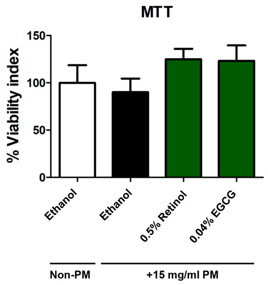 To assess potential toxicity from topical exposure to 0.5% retinol and 0.04% EGCG of PM-exposed skin tissues, tissue viability was measured using the MTT assay after 4 days of treatment. As shown in Figure 6, the viability index, normalized to tissue weight, showed no significant decrease compared to non-PM exposed tissues. These findings indicate that the tested concentrations did not induce toxicity under PM-induced skin damage conditions.