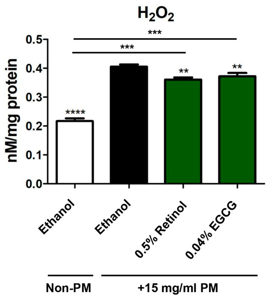 Assessment of H2O2 levels in human ex vivo skin exposed to PM after topical-based treatment. Abdominal skin from a 40-year-old female donor was pretreated for 2 h with 2% ethanol + 1% Tween 20 (vehicle control, with or without PM exposure), 0.5% retinol, or 0.04% EGCG. After pretreatment, tissues were topically exposed to 15 mg/mL PM for an additional 6 h. H2O2 levels in the tissue culture medium after 3 days of treatment were normalized to total protein concentration and expressed as nM/mg of protein. Data are presented as mean ± SD, based on three tissue samples with two wells per sample. Asterisks on bars indicate significance vs. vehicle with PM; asterisks on lines indicate significance vs. vehicle without PM. **, p < 0.01; ***, p < 0.001; ****, p < 0.0001.