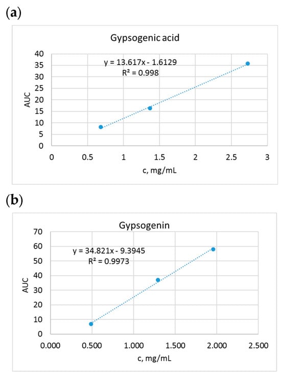 Figure 1. Calibration curves of gypsogenic acid (a) and gypsogenin (b).