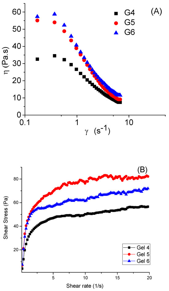 Figure 2. Viscosity (A) and shear stress as a function of shear rate (B) for Gel 4, Gel 5 and Gel 6 at 25 °C.