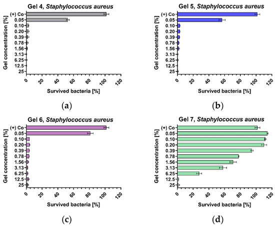 Gel 4, 5 and 6 inhibited the growth of Staphylococcus aureus (Figure 3) in concentrations of 0.1%, whereas G7 was less active and showed a MIC of 6.25%.