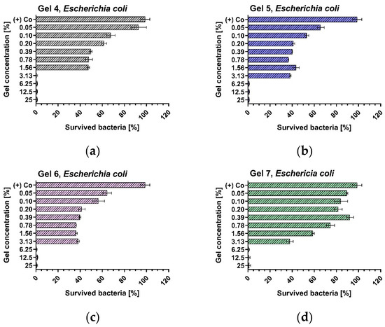 Inhibition of Escherichia coli strain growth (Figure 4) occurred after exposure to 3.125% of G6 and 6.25% of G4, G5 and G7. The minimal bactericidal concentrations of the four gels ranged from 3.125% to 12.5%, wherein Gel 4 exhibited the strongest activity.