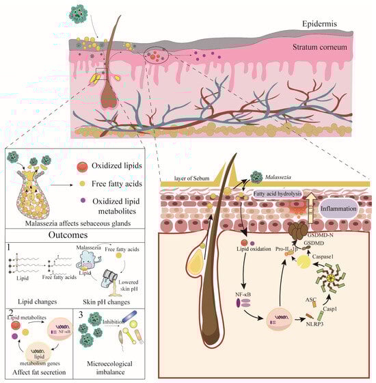 - Altering the Sebaceous Gland Microenvironment to Promote Malassezia Proliferation: The metabolites of Malassezia alter the microenvironment of the sebaceous glands, making it more conducive to the growth of Malassezia [67]. For example, the free fatty acids generated by the decomposition of sebum by Malassezia acidify the skin’s surface, creating a low-pH environment that is more favorable for Malassezia proliferation. At the same time, the fatty acids contained in sebum, such as oleic acid, provide abundant nutrients for Malassezia, promoting its rapid proliferation in the sebaceous gland area [68];