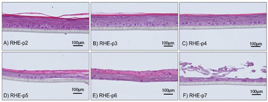 To appreciate the effects of varying passages of NHEKs on in vitro epidermal reconstruction, we cultivated these cells across a range of passages from 2 to 7 (p2 to p7). This approach was designed to approximate the Hayflick limit, thus simulating cellular senescence. As expected, histological analysis of the RHEs using NHEKs from these different passages revealed distinct morphological differences associated with the passage number. Specifically, RHE samples from early passages (p2 to p4) exhibited a normal epidermal morphology (Figure 1A–C). These models were distinguished by complete epidermal stratification observed with the four expected cell layers, indicative of the effective establishment of the terminal differentiation program in keratinocytes. However, with increasing passage numbers, significant morphological changes were observed (Figure 1D–F). RHEs constructed with NHEKs at p5 and p6 displayed a thinner epidermal layer, along with a disrupted differentiation program, evidenced by the presence of nuclei or parakeratosis in the cornified layer. The most pronounced alterations were observed in RHEs derived from NHEKs at p7. These samples showed marked disorganization, complete lack of stratification, and severe impairment in both the differentiation program and epidermal integrity.
