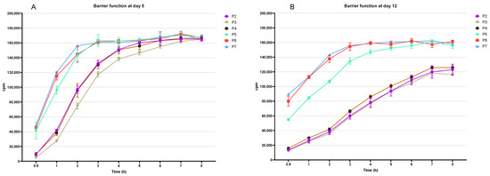 Assessment of the epidermal barrier function of reconstructed human epidermis (RHE) from normal human epidermal keratinocytes (NHEKs) at various passages. The permeability of caffeine was measured to evaluate barrier integrity in RHEs constructed with NHEKs at passages 2 to 7, cultured for either 5 days (D5) (A) or 12 days (D12) (B). RHEs from early-passage NHEKs (p2 to p4) showed lower permeability, indicating a more functional barrier compared to those from late-passage NHEKs (p5 to p7), which exhibited higher permeability and compromised barrier function.